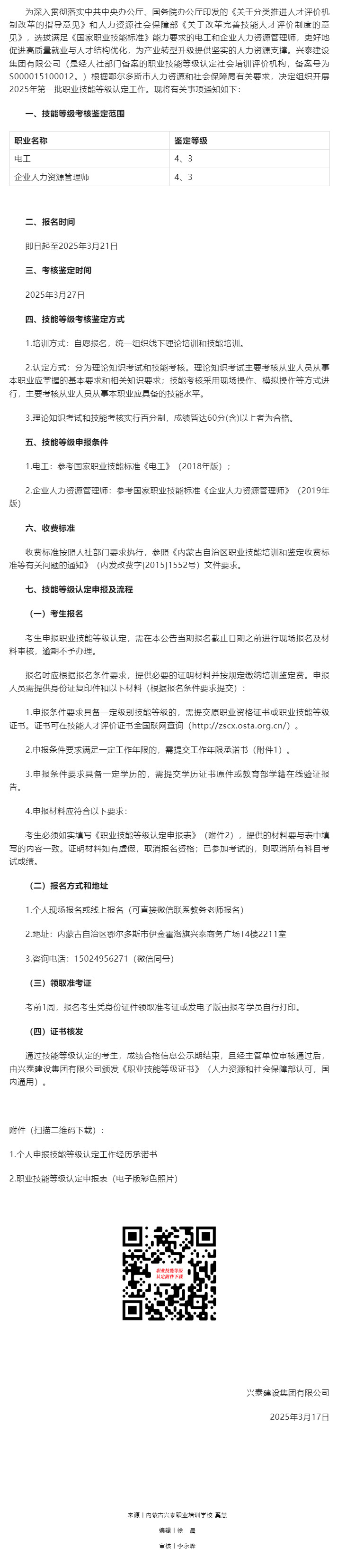 興泰建設集團有限公司2025年第一批職業(yè)技能等級認定公告